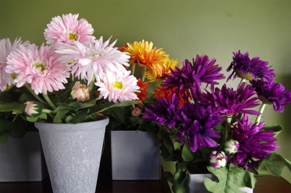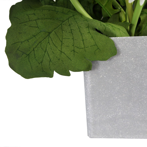 Leaf Design artificial plant. Measures: 33cm tall x 25cm x 25cm. The overall measurement is given at the tallest point as measured from the floor. This plant This plant is potted in a plastic weighted pot. Potted Daisy with 7 flowers 2 buds 10 leaves grey plastic pot