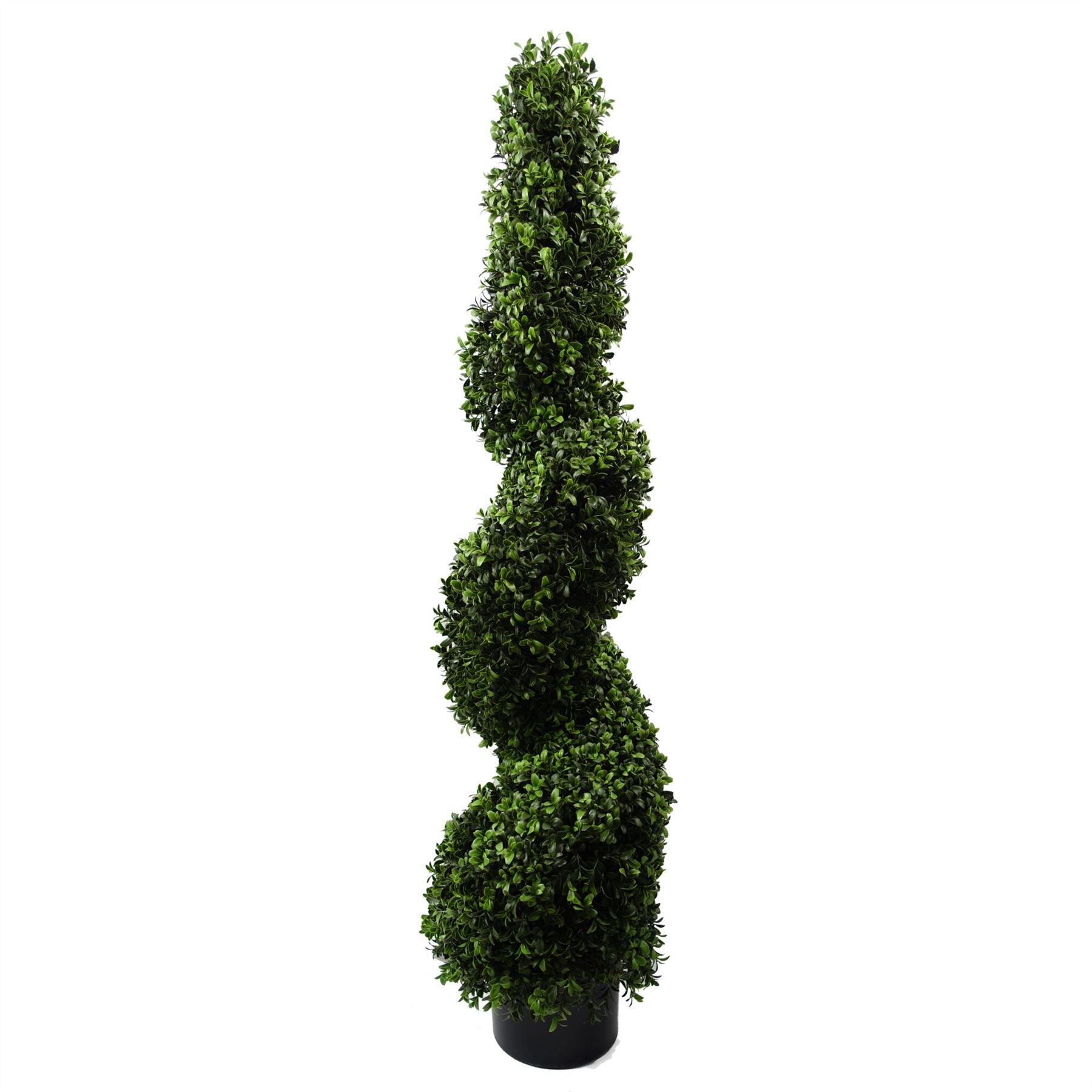 A highly realistic replica of twisted topiary tree in a large 120cm size. This tree is UV resistant with dense bushy leaves and designed to be used outdoors. As we have it arranged in our photos this measures 120cm high x 30cm x 30cm. Fixed branches and requires no arrangement. Plastic weighted pot measures: 18cm (d) x 14cm (h) approx. Potted in a plain plastic pot and is ready to display. You can make these trees look all the more impressive by popping inside a larger planter and covering with soil- bark or gravel to add to the realistic effect. Genuine Botanik UK Product.